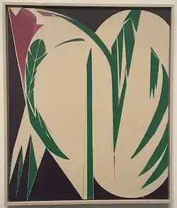 Starting in 1970, Krasner began making large horizontal paintings made up of hard-edge lines and a palette of a few bright colors that contrasted one another.[81] She painted in this style until about 1973. Three years later, she started working on her second series of collage images. She began working on these after cleaning out her studio and discovered some charcoal drawings mostly of figure studies that she completed from 1937 to 1940. After saving a few, Krasner decided to use the rest in a new series of collages. In this work, the black and gray shapes of the figure studies are juxtaposed against the blank canvas or the addition of brightly colored paint.[79] The hard-edged shapes of the cut drawings are reconstructed into curvilinear shapes that recall floral patterns. Texture is induced through the contrast of the smooth paper and rough canvas.[82] Since the figure studies are cut up and rearranged without consideration of their original intention or message, the differences between the old drawings and new structures are highly exaggerated.[83] All of the collages' titles from this series are different verb tenses interpreted as a critique of Greenberg's and Michael Fried's insistence on the presentness of modern art.[84] This series was very well received by a large audience when they were exhibited in 1977 at the Pace Gallery. It is also considered a statement about how artists need to reexamine and rework their style in order to stay relevant as they grow older.[85]