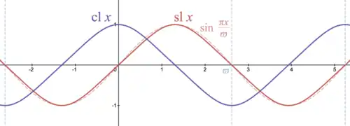 As complex functions , sl and cl have a square period lattice (a multiple of the Gaussian integers ) with fundamental periods { ( 1 + i ) ϖ , ( 1 − i ) ϖ } , {\displaystyle \{(1+i)\varpi ,(1-i)\varpi \},} [ 4] and are a special case of two Jacobi elliptic functions on that lattice, sl z = sn ( z ; − 1 ) , {\displaystyle \operatorname {sl} z=\operatorname {sn} (z;-1),} cl z = cd ( z ; − 1 ) {\displaystyle \operatorname {cl} z=\operatorname {cd} (z;-1)} .