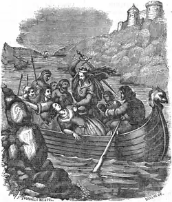 The queen is rescued and her Muslim ladies-in-waiting are taken with her. On the ship home, Ramiro falls asleep with his head on his wife's lap, only to be awakened by her sobbing. She explains that she is weeping for Abencadão. An enraged Ramiro ties a millstone around her neck and thrusts her overboard, drowning her. Back at court, Ramiro has Ortiga baptized and marries her. She bears him a son, baptized Alboazar, nicknamed Cide (from Arabic sayyid, lord). He would go on to conquer many towns from the Muslims in the Reconquista.[1] The historical Aboazar Lovesendes, ancestor of the Maia family, was not Ramiro's son. His father would have been named Leodesindo.[2]