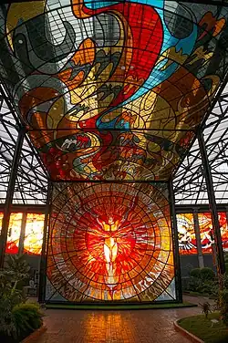 However, his two best known works are located in the city of Toluca, the Cosmovitral, which today serves as an important identity marker for the State of Mexico and Aratmósfera. The Cosmovitral was a renovation of an old Porfirio Díaz era market. The interior was turned into a botanical garden and the windows were replaced by large glass murals with 48 panels which cover an area of 3,200 m2. Inaugurated in 1980, the theme of the work is the opposition of day and night, woman and man, and good and bad.[2][6][15] The glass work used about 75 tons of metal substructure, 45 tons of blown glass and 25 tons of lead solder.[6] The Cosmovitral was named in 2007 as one of thirteen wonders of Mexico and in 2008 it received the Excelsis prize from the Global Quality Foundation.[2]