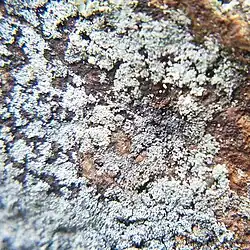Leprocaulon adhaerens is a species of leprose lichen in the family Leprocaulaceae,[2] found in North America. It was originally described in 2007 as Lepraria adhaerens and later transferred to the genus Leprocaulon in 2013 based on molecular and morphological studies. The lichen forms a granular crust that adheres tightly to both the substrate (usually rocks) and itself, often growing over mosses and other lichens. It is chemically distinct due to its production of pannarin, zeorin, and several minor secondary metabolites. The species is known from coastal southern California, Pennsylvania, and Missouri, though its distribution may be more extensive than currently documented.