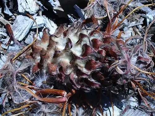 Periodic wildfires are an important factor in south and west South Africa. The occurrence of these fires among other things determines the extent of fynbos. All species that naturally occur in the fynbos have adaptations that ensure these species can survive the natural fire regime, but different species have different strategies.[15] This is also true for the species of Leucospermum, even the few that occur outside the fynbos. A large majority of Leucospermum species is killed by fire because these have a single stem that only branches higher up, and are covered by a rather thin bark. One year after the fire however, many seedlings have occurred. All specimens within the area covered by the most recent fire, are therefore of the same age. After three to four years, these plants begin to flower and produce seeds, that do not yet germinate, but remain in the soil seed bank, until they get activated during the aftermath of a fire. Specimens belonging to these species are subject to biological aging (or senescence), and lose their vitality. The maximum life expectancy differs between twenty-five to thirty years in smaller species like L. truncatulum and L. oleifolia, to fifty to eighty years in L. praemorsum. For this group of species, fire is a prerequisite to rejuvenate and so maintain the population. If the fires occur as frequent as every two or three year however, the soil seed bank gets depleted because no new seeds are added, and the species may locally disappear. A number of large species (L. conocarpodendron, L. heterophyllum, L. patersonii, L. pedunculatum, L. profugum and L. royenifolium) have thick bark, which allows them to survive fires if these are not too intense, and so stretch their lifespan regularly beyond the interval between successive incidents. The fire survival rate in this group was estimated at 30–50 %. Since the fire destroys lower branches, regrowth only takes place from the higher branches, and the plants attain an umbrella-shape. A smaller group of Leucospermum species has a more effective method to survive fire. Above ground parts of these species die, but new shoots appear directly from the ground from woody tubers. This mechanism is best developed in the species of the section Crassicaudex (L. cuneiforme, L. gerrardii, L. innovans and L. saxosum) that mostly occur outside the fynbos, in areas with dominant summer rainfall where fires may be more frequent, but is also present in L. hypophyllocarpodendron, L. prostratum and L. tomentosum. The survival rate in this group is estimated at 95% or more. The young plants of these species can be distinguished because of the profuse development of side branches very low on the primary stem.[2]