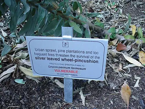 - ^ Rebelo, A.G.; Raimondo, D.; von Staden, L.; Schutte-Vlok, A.L. (2020). "Leucospermum formosum". IUCN Red List of Threatened Species. 2020: e.T113172309A185532641. doi:10.2305/IUCN.UK.2020-3.RLTS.T113172309A185532641.en. Retrieved 19 November 2021.