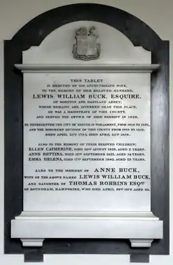 "This tablet is erected by his affectionate wife to the memory of her beloved husband lewis William Buck Esquire of Moreton and Hartland Abbey whose remains are interred near this place. He was a magistrate of this county and served the office of High Sheriff in 1826. He represented the City of Exeter in Parliament from 1826 to 1832 and the Northern Division of this county from 1839 to 1858. Born April 25th 1784, died April 25th 1858. Also to the memory of their beloved children: Ellen Catherine, died 30th August 1828 aged 2 years; Anne Bettina, died 12th September 1823 aged 14 years; Emma Helena, died 17th September 1849 aged 23 years. Also to the memory of Anne Buck wife of the above named Lewis William Buck, and daughter of Thomas Robbins Esq.re of Roundham, Hampshire, who died April 26th 1879 aged 88".