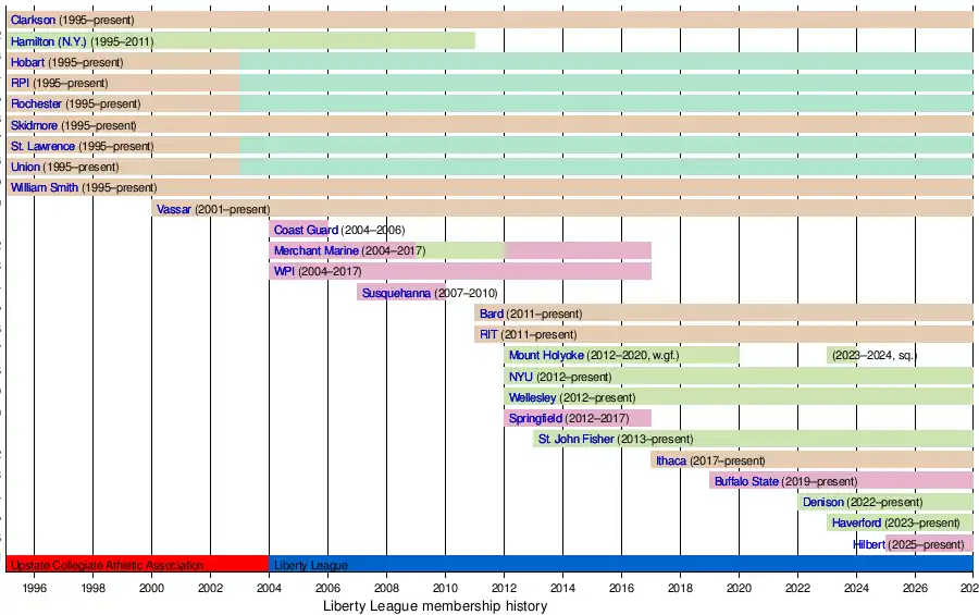 - ^ Hamilton left the Liberty League after the 2010–11 school year in order to fully align with the New England Small College Athletic Conference (NESCAC), of which it has been a charter member since 1971. The school previously held dual membership with both the Liberty and NESCAC conferences.