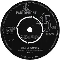 Tages initially previewed the song on the Sveriges Television show Timmen, recorded and broadcast on 11 November 1967.[14] A few weeks later, Parlophone released "Like a Woman" as part of Tages fifth album Studio, on 4 December 1967.[15] On the album, the song is sequenced as the third track, in between "It's My Life" and "People Without Faces".[15] Two months later, on 8 February 1968, the song was issued as the B-side of Tages' single "There's a Blind Man Playin' Fiddle in the Street", apparently in a lack of new material.[16] Despite being a B-side, "Like a Woman" managed to gain a chart position in Denmark, reaching number 20 on the Danmarks Radio top-twenty chart in late February of that year.[17] It was their final charting song in that country.[17] Tages also performed it in the 1968 short film Dalamania, which starred them.[18]