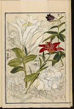 During the Edo period, the Satsuma Domain would present the emperor with 12 stalks of L. nobilissimum yearly.[8][11][12] Information about the plant was kept hidden from outsiders, having only noted that it was grown on a southern island.[13][10] Dubbed the "fragrant lily", at one point, the lily was overharvested following the Occupation of Japan and became extinct in the wild.[13] The Tokara Islands were left poor following the war, and smugglers would arrive at the island offering high prices for the lily's bulbs. The islanders would react by harvesting the lilies as much as they could, with the youth taking lunch boxes and filling them with forty to fifty bulbs of the lily each.[12] The lily survived through seeds that were saved by enthusiasts, with locals and researchers at Nagasaki University now undergoing a replanting program to ensure the species' continued survival.[6][13][11] There are some who believe that the current strain of L. nobilissimum differ from the wild type.[13][12]