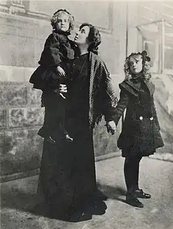 When the theater next to the candy store burned down, the family moved to New York, where the girls helped their mother run a candy and popcorn stand at the Fort George amusement grounds.[8] They became good friends with a next-door neighbor, Gladys Smith. Gladys was a child actress who did some work for director D. W. Griffith, and later took the stage name Mary Pickford.[9] When Lillian and Dorothy were old enough, they joined the theatre, often traveling separately in different productions. They also took modeling jobs, with Lillian posing for artist Victor Maurel in exchange for voice lessons.[10]