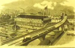 In 1849 James Rendel was asked to devise a scheme to improve the infrastructure, which was dilapidated. He reported that "if [the Navigation] is to compete successfully with Railways, it should be made an efficient branch of the Thames, viz. navigable by the largest class of barges there employed".[24] He proposed, besides numerous improvements on the river proper, the reconstruction of Bromley Lock; deepening the Limehouse Cut; forming a towing path under Britannia Bridge (Commercial Road); and the construction of a new outfall lock into the Thames, with cills 19 feet below Trinity High Water, and with tide gates.[25]