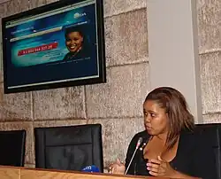 Her racial identity was a common point of derision, with critics suggesting that her educational and class background undermined her claim to a genuine or representative black identity.[45] Discourse in this regard predated Mazibuko's election as parliamentary leader; in February 2011, for example, ANC politician Blade Nzimande had called her a "coconut" during a parliamentary debate.[46] It mounted during and after her 2011 election campaign: the ANC's Jackson Mthembu described Mazibuko as "so naive when it comes to African traditions that she cannot relate to them",[47] and Mnqasela, Mazibuko's own colleague, faced disciplinary charges in the DA for allegedly saying, "If you close your eyes and listen to Lindiwe Mazibuko when she speaks, you would say a white person is talking to you".[48] In December 2013, when Mazibuko appeared on a special South African edition of the BBC’s Question Time,[49] she was called a "house nigger" by another panel member, Andile Mngxitama.[50] Her "distinctly plummy English accent" was often noted,[45] and Stephen Grootes suggested that Mazibuko's accent – along with other class markers – was a genuine electoral liability insofar as it undermined her "mass appeal".[51]