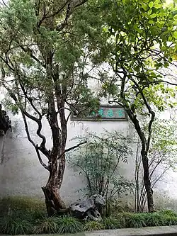 | Old Intertwined Trees Court (古木交柯) A complex and unique structure composed of a courtyard, open 3 bay hall, and covered corridor which functions as a single space. The courtyard is planted with two trees symbolizing jade (Magnolia soulangia) and gold (Osmanthus fragrans), a sign of prosperity. The entry to this space is marked by a tablet inscribed by Deputy Prime Minister Zhu Boqi which read, "Paradise on Earth".[2] |
