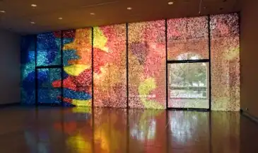 In a series of subsequent installations Hoke explored color chromatics and surface sensations to a greater degree, using colored paper and beverage cups as her materials. Light My Fire (Aldrich Museum, 2001; Rice University, 2006) consisted of short, variously cropped red, pink, yellow and white paper scrolls adhered to five adjacent windows; it exploited shifting sunlight to create a lace-like effect dappling the space with spots of light and color that changed (and faded in intensity) over time.[6][21] For the mural-like Gravity of Color (Elizabeth Harris, 2004), Hoke employed protruding paper cups and plastic beakers partially filled with paint to create jewel-like, serpentine forms of rich color that critics related to the encrusted walls of Gaudi and the swirling patterns of Seurat and Klimt paintings.[13][46] Hoke reworked the piece at the Katonah Museum of Art (2005)[47] and in a two-story, six-year installation at the New Britain Museum (2008).[46][4]