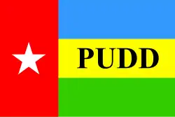 | | Flag of People's Party of Development | The PDP's flag is a horizontal tricolour in blue, white and yellow. In the centre is the party abbreviation PDP and above it in the blue stripe a mountain range.[5] |