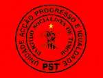 | 2012 | In anticipation of the 2012 parliamentary elections. The flag had been redesigned to a ~1:2 red flag with a black hoist stripe (width approx. 1/8 of the flag) with a yellow party emblem on the red area, shifted to the hoist, and white lettering (set in white sans serif upper case letters) spelling large "PST" on the hoist stripe, vertically with each letter pointing down, and the party name on the red area, on one line middle to fly. The emblem is quite different from the previous, showing three (five-pointed upright regular) stars set in an equilateral triangle, two of them on a vertical axis and the third off to the fly, enclosing a hammer over what seems to be an eclipsed sun in the style of a gear. |