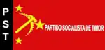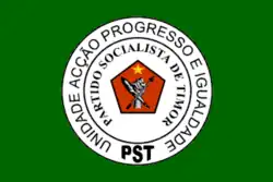 | 2000 | Flag of Socialist Party of Timor | Socialist Party of Timor: green flag with a circular badge centered. The symbol in the flag is a simplified version of the complete symbol, which consists of a white seal with "UNIDADE ACÇÃO PROGRESSO E IGUALDADE" and "PST" in an outer arc and "PARTIDO SOCIALISTA DE TIMOR" in an inner arc and a hexagon in the center, red with a golden star, a closed fist, a pen and a spear. |