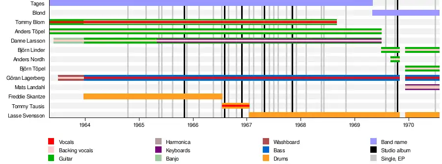 Tages were a Swedish rock band formed in 1963, initially as a skiffle group.[1] Their line-up during their breakthrough in 1964 consisted of Tommy Blom, Göran Lagerberg, Danne Larsson, Anders Töpel and Freddie Skantze. When they split up in 1970 during the name Blond, they consisted of Lagerberg, Lasse Svensson, Björn Linder, Björn Töpel and Mats Landahl.
