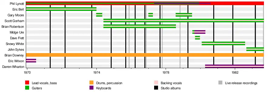 Thin Lizzy were formed in December 1969, with four members joining from two bands: guitarist Eric Bell and keyboardist Eric Wrixon from Them, and bassist and vocalist Phil Lynott and drummer Brian Downey from Orphanage.[1] Wrixon performed on the band's debut single "The Farmer", but left before it was released in July 1970.[2] Bell left the band after a concert on New Year's Eve 1973, later citing "ill-health caused by the band's lifestyle" as the reason for his departure.[3] The guitarist was replaced by Gary Moore, although he would only remain with the band for a matter of months.[4] Andy Gee and John Du Cann took over for a tour in May, before Brian Robertson and Scott Gorham were enlisted later in the year as Bell's first full-time replacements.[5]