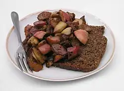 | Æbleflæsk | | Denmark | Æbleflæsk is a traditional dish in Danish cuisine. The dish made of bacon, onions, apples, and sugar served on rugbrød.[4] |