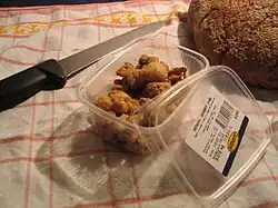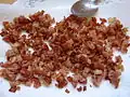 | Bacon bits | | Real bacon bits are made from bacon that has been cooked, then dried, then crushed into small pieces.[11] Imitation bacon bits are fashioned from textured vegetable protein.[12][13] Bacon bits are commonly used as a topping or garnish, and they can be incorporated into foods as an ingredient.[11] | |