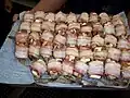 | Bacon-wrapped shrimp | | Bacon-wrapped shrimp are shrimps which have the tails removed and are wrapped in bacon.[24] | |