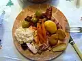 | Kugelis | | Lithuania | A Lithuanian national dish that can be described as a casserole made with potatoes, onion, milk, bacon and eggs and eaten with apple sauce. |