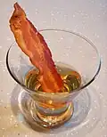 | Bacon martini | | United States | A bacon martini is made by soaking strips of browned bacon in vodka for at least a day.[22] It is finished when the vodka becomes opaque.[23] A bacon martini is served by pouring it into a mixing glass half full of ice cubes and mixing in a little vermouth.[22] |