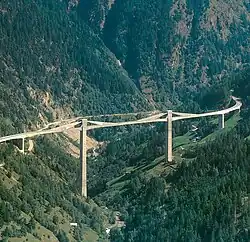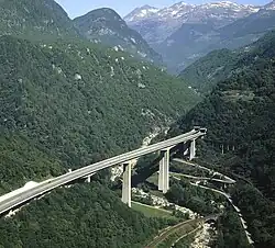 ![]() | 6 | Biaschina-Viadukt | 160 m (520 ft) | 645 m (2,116 ft) | Box girder Prestressed concrete Twin bridges 140+160+140 | 1980 | Giornico 46°25′15.1″N 8°51′27.2″E / 46.420861°N 8.857556°E | Ticino | [S 37] [27] | |