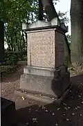 Over time the cemetery became a popular and prestigious burial ground for those of many areas of society. The wealthy merchant A.I. Kosikovsky was buried under a monumental sarcophagus on a high pedestal surmounted by a canopy on eight fluted columns.[4] Opposite it stood a similarly grand monument to the statesman Pavel Demidov, which has since been lost.[4] In 1857 the remains of the composer Mikhail Glinka were returned from Berlin and buried in the cemetery, with a grand monument erected two years later to the design of architect I. I. Gornostayev, with sculptures by Nikolay Laveretsky.[4][9] On 1 February 1881 the author Fyodor Dostoevsky was buried in the cemetery, with a similarly large monument.[4][10] During the 1880s composers Modest Mussorgsky and Alexander Borodin were buried in the northern part of the grounds, with Pyotr Ilyich Tchaikovsky following in 1891.[4][11][12][13]