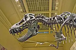 Triceratops horridus AMNH 5116 (copy) Field Museum of Natural History Chicago Illinois USA Skeleton, mounted Triceratops horridus BMRP 2006.4.1 Homer Burpee Museum of Natural History Rockford Illinois USA Sub-adult specimen Skull Triceratops horridus FMNH P12003 Field Museum of Natural History Chicago Illinois USA Skeleton, mounted Triceratops prorsus CM 1219 Carnegie Museum of Natural History Pittsburgh Pennsylvania USA Skeleton, mounted Triceratops prorsus LACM 151459 Natural History Museum of Los Angeles County Los Angeles California USA Skeleton, mounted Tyrannosaurus AMNH 5027 American Museum of Natural History New York New York USA Skeleton, mounted (copy) Tyrannosaurus AMNH 5027 (copy) Denver Museum of Nature and Science Denver Colorado USA Skeleton, mounted (copy) Tyrannosaurus AMNH 5027 (copy) Academy of Natural Sciences of Drexel University Philadelphia Pennsylvania USA Skeleton, mounted Tyrannosaurus BHI 3033 Stan Black Hills Museum of Natural History Hill City South Dakota USA Found in 1987.[ 5] Skeleton, mounted (copy) Tyrannosaurus BHI 3033 (copy) Stan (copy) Dinosaur Discovery Museum Kenosha Wisconsin USA Skeleton, mounted (copy) Tyrannosaurus BHI 3033 (copy) Stan (copy) Houston Museum of Natural Science Houston Texas USA Skull (copy) Tyrannosaurus BHI 3033 (copy) Stan (copy) Jurica-Suchy Nature Museum Lisle Illinois USA Skeleton, mounted (copy) Tyrannosaurus BHI 3033 (copy) Stan (copy) National Museum of Natural History Washington, D.C. District of Columbia USA Skeleton, mounted (copy) Tyrannosaurus BHI 3033 (copy) Stan (copy) New Mexico Museum of Natural History and Science Albuquerque New Mexico USA Skeleton, mounted (copy) Tyrannosaurus BHI 3033 (copy) Stan (copy) Sternberg Museum of Natural History Fort Hays Kansas USA Skeleton, mounted (copy) Tyrannosaurus BHI 3033 (copy) Stan (copy) The Children's Museum of Indianapolis Indianapolis Indiana USA Skeleton, mounted (copy) Tyrannosaurus BHI 3033 (copy) Stan (copy) Weis Earth Science Museum Menasha Wisconsin USA Skeleton, mounted (copy) Tyrannosaurus BHI 3033 (copy) Stan (copy) Wyoming Dinosaur Center Thermopolis Wyoming USA Skeleton, mounted Tyrannosaurus BMR P2002.4.1 Jane Burpee Museum of Natural History Rockford Illinois USA Juvenile specimen Skeleton, mounted (copy) Tyrannosaurus BMR P2002.4.1 (copy) Jane (copy) Carnegie Museum of Natural History Pittsburgh Pennsylvania USA Skeleton, mounted (copy) Tyrannosaurus BMR P2002.4.1 (copy) Jane (copy) Cleveland Museum of Natural History Cleveland Ohio USA Skeleton, mounted Tyrannosaurus rex CM 9380 Carnegie Museum of Natural History Pittsburgh Pennsylvania USA Holotype specimen Skeleton, mounted Tyrannosaurus FMNH PR2081 Sue Field Museum of Natural History Chicago Illinois USA Found in 1990. Most complete. Largest T.rex fossil specimen. Approx. 40 feet long, estimated 9.5 tons (live).[ 5] Skeleton, mounted (copy) Tyrannosaurus FMNH PR2081 (copy) Sue (copy) Disney's Animal Kingdom Bay Lake Florida USA Skeleton, mounted Tyrannosaurus HMNS 2006.1743.01 Wyrex Houston Museum of Natural Science Houston Texas USA Skeleton, mounted Tyrannosaurus LACM 150167 Thomas Natural History Museum of Los Angeles County Los Angeles California USA Skeleton, mounted Tyrannosaurus LACM 23844 Natural History Museum of Los Angeles County Los Angeles California USA Skeleton, mounted Tyrannosaurus LACM 23845 Natural History Museum of Los Angeles County Los Angeles California USA Skeleton, mounted Tyrannosaurus LACM 28471 Natural History Museum of Los Angeles County Los Angeles California USA Juvenile specimen Skeleton, mounted Tyrannosaurus MOR 555 Wankel Rex National Museum of Natural History Washington, D.C. District of Columbia USA On lease from U.S. Army Corps of Engineers [ 6] Skeleton, mounted (copy) Tyrannosaurus MOR 555 (copy) Big Mike Museum of the Rockies Bozeman Montana USA Big Mike is a bronze cast of MOR 555 Skeleton, mounted (copy) Tyrannosaurus MOR 555 (copy) University of California Museum of Paleontology Berkeley California USA Skeleton, mounted (copy) Tyrannosaurus MOR 555 (copy) Cleveland Museum of Natural History Cleveland Ohio USA Skeleton, mounted (copy) Tyrannosaurus MOR 555 (copy) Googleplex Mountain View California USA Skeleton, mounted (copy) Tyrannosaurus MOR 555 (copy) Perot Museum of Nature and Science Dallas Texas USA Skeleton, mounted Tyrannosaurus MOR 980 Peck's Rex Museum of the Rockies Bozeman Montana USA Skeleton, mounted (copy) Tyrannosaurus MOR 980 (copy) Peck's Rex (copy) Carnegie Museum of Natural History Pittsburgh Pennsylvania USA Skeleton, mounted (copy) Tyrannosaurus MOR 980 (copy) Peck's Rex (copy) Maryland Science Center Baltimore Maryland USA Skeleton, mounted Tyrannosaurus RTMP 81.6.1 Black Beauty Royal Tyrrell Museum Drumheller Alberta Canada Skeleton, mounted Tyrannosaurus RTMP 81.12.1 Huxley T.rex Royal Tyrrell Museum Drumheller Alberta Canada Skeleton, mounted Tyrannosaurus TCM 2001.90.1 Bucky The Children's Museum of Indianapolis Indianapolis Indiana USA Skeleton, mounted (copy) Tyrannosaurus TCM 2001.90.1 (copy) Bucky (copy) Houston Museum of Natural Science Houston Texas USA Skeleton, mounted (copy) Zuniceratops christopheri MSM P 4185 (copy) Arizona Museum of Natural History Mesa Arizona USA Skull (copy) Zuniceratops christopheri MSM P 4185 (copy) Natural History Museum of Utah Salt Lake City Utah USA