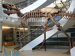 Type of Exhibit Taxon Catalogue Number Nickname Exhibiting Institution City State Country Notes Image Skeleton, mounted Acrocanthosaurus atokensis NCSM 14345 Fran North Carolina Museum of Natural Sciences Raleigh North Carolina USA Skeleton, mounted (copy) Acrocanthosaurus atokensis NCSM 14345 (copy) Houston Museum of Natural Science Houston Texas USA Skull Albertosaurus sarcophagus TMP 1985 098 0001 Royal Tyrrell Museum Drumheller Alberta Canada Skeleton, mounted Allosaurus fragilis AMNH 5753 American Museum of Natural History New York New York USA Skeleton, mounted Allosaurus fragilis CM 11844 Carnegie Museum of Natural History Pittsburgh Pennsylvania USA Skeleton, mounted Allosaurus fragilis DMNS 2249 Denver Museum of Nature and Science Denver Colorado USA Skeleton, mounted Allosaurus fragilis LACM 46030 Natural History Museum of Los Angeles County Los Angeles California USA Skeleton, mounted (copy) Allosaurus jimmadseni MOR 693 (copy) Big Al (copy) Museum of the Rockies Bozeman Montana USA Skeleton, mounted (copy) Allosaurus jimmadseni SMA 0005 (copy) Big Al 2 (copy) Houston Museum of Natural Science Houston Texas USA Skeleton, mounted Anchiceratops NMC 8547 (body), NMC 8535 (copy of skull) Canadian Museum of Nature Ottawa Ontario Might represent a separate taxon Partial skull Anchiceratops ornatus FMNH P15003 Field Museum of Natural History Chicago Illinois USA Partial skull Anchiceratops ornatus ROM 802 Royal Ontario Museum Toronto Ontario Canada Skull Anchiceratops ornatus TMP 1983.001.0001 Royal Tyrrell Museum Drumheller Alberta Canada Skeleton, mounted Apatosaurus AMNH 460 American Museum of Natural History New York New York USA Skeleton, mounted Apatosaurus louisae CM 3018 Carnegie Museum of Natural History Pittsburgh Pennsylvania USA Skeleton, mounted Apatosaurus FMNH P25112/FMNH P27021 Field Museum of Natural History Chicago Illinois USA May represent a novel species within Apatosaurus Skeleton, mounted (copy) Barosaurus lentus AMNH 6341 (copy) American Museum of Natural History New York New York USA Skeletal elements, unmounted Brachiosaurus altithorax FMNH P 25107 Field Museum of Natural History Chicago Illinois USA Holotype specimen Skeleton, mounted (copy) Brachiosaurus altithorax FMNH P 25107 (copy) Field Museum of Natural History Chicago Illinois USA Cast of the holotype specimen Skeleton, mounted (copy) Brachiosaurus altithorax FMNH P 25107 (copy) O'Hare International Airport Chicago Illinois USA Cast of the holotype specimen Skeleton, mounted Brontosaurus excelsus YPM 1980 Peabody Museum of Natural History New Haven Connecticut USA Holotype specimen Skeleton, panel mounted Camarasaurus lentus CM 11338 Carnegie Museum of Natural History Pittsburgh Pennsylvania USA Skeleton, mounted Camptosaurus aphanoecetes CM 11337 Carnegie Museum of Natural History Pittsburgh Pennsylvania USA Skull Centrosaurus apertus AMNH 5427 American Museum of Natural History New York New York USA Skull Centrosaurus apertus ROM 767 Royal Ontario Museum Toronto Ontario Canada Skeleton, mounted Chasmosaurus belli ROM 843 Royal Ontario Museum Toronto Ontario Canada Skeleton, mounted Corythosaurus casuarius CM 5856 Carnegie Museum of Natural History Pittsburgh Pennsylvania USA Skull Cryolophosaurus ellioti FMNH PR1821 (copy) Field Museum of Natural History Chicago Illinois USA Real skull in collections Skeleton, mounted (copy) Cryolophosaurus ellioti FMNH PR1821 (copy) Fryxell Geology Museum Rock Island Illinois USA Skeleton, mounted (copy) Cryolophosaurus ellioti FMNH PR1821 (copy) Orton Geological Museum Columbus Ohio USA Skull Daspletosaurus horneri MOR 590 Museum of the Rockies Bozeman Montana USA Holotype specimen Skeleton, mounted Daspletosaurus torosus CMN 8506 Canadian Museum of Nature Ottawa Ontario Canada Holotype specimen Skeleton, mounted Daspletosaurus FMNH PR308 Gorgeous George Field Museum of Natural History Chicago Illinois USA Originally assigned to Gorgosaurus Skeleton, mounted Diplodocus carnegiei CM 84 Dippy Carnegie Museum of Natural History Pittsburgh Pennsylvania USA Holotype specimen Skeleton, mounted Diplodocus longus DMNH 1494 Denver Museum of Nature and Science Denver Colorado USA Skeleton, mounted Dracorex hogwartsia TCMI 2004.17.1 The Children's Museum of Indianapolis Indianapolis Indiana USA Skeleton, mounted Dryosaurus elderae CM 3392 Carnegie Museum of Natural History Pittsburgh Pennsylvania USA Model Dryptosaurus aquilunguis Bess Bower Dunn Museum Libertyville , Illinois USA Skeleton, mounted Edmontonia rugosidens AMNH 5665 American Museum of Natural History New York New York USA Skeleton, mounted Edmontosaurus annectens AMNH 5730 and AMNH 5886 American Museum of Natural History New York New York USA Fossil mummy Edmontosaurus annectens AMNH 5060 Trachodon mummy American Museum of Natural History New York New York USA Skull Edmontosaurus annectens LACM 23502 Natural History Museum of Los Angeles County Los Angeles California USA Skeleton Edmontosaurus annectens YPM 2182 Peabody Museum of Natural History New Haven Connecticut USA Skeleton Gorgosaurus libratus AMNH 5458 American Museum of Natural History New York New York USA Skeleton Gorgosaurus libratus USNM 12814 National Museum of Natural History Washington D.C. USA formerly AMNH 5428 Skeleton Gorgosaurus libratus TMP 91.36.500 Royal Tyrrell Museum of Palaeontology Drumheller Alberta Canada Sub-adult specimen Skeleton Gorgosaurus sternbergi AMNH 5664 American Museum of Natural History New York New York USA now recognized as a juvenile Gorgosaurus libratus Skull Lambeosaurus lambei AMNH 5353 American Museum of Natural History New York New York USA Skeleton Lambeosaurus lambei FMNH PR 380 (body) UC 1479 (head)