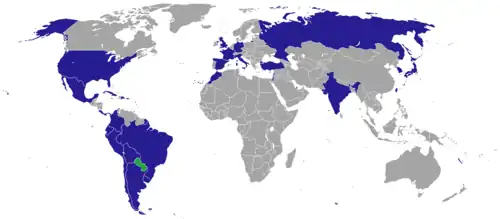 - ^ a b c d e f g h i j k l m n o p q r s t u v w x y z aa ab ac ad ae af ag ah ai aj ak al am an ao ap aq ar as at au av aw ax ay az ba bb bc bd be bf bg bh bi bj bk bl bm bn bo bp bq br bs bt bu bv bw bx by bz ca cb cc cd ce cf cg ch ci cj ck cl cm cn co cp cq cr cs ct cu cv cw cx cy cz da db dc dd "Representaciones Extranjeras Acreditadas en Paraguay" [Foreign Representatives Accredited in Paraguay]. Ministry of Foreign Affairs of Paraguay (in Spanish). Retrieved 18 September 2024.