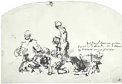 ![]() | A Child Being Taught to Walk | c. 1660-1662 | Pen and brown ink on brownish-cream paper | 9.3 x 15.4 cm | British Museum, London | Inscribed on reverse 'dit voor af te vragen / [vr]agen aen ons beijde oft wijt an de Heeren / [g?]oede mannen willen laten ver blijben / dan tijssen te vragen of Hij niet een / beijden d schilderien gelieft opgemaeckt te hebben / geen van beijden begerende.' |