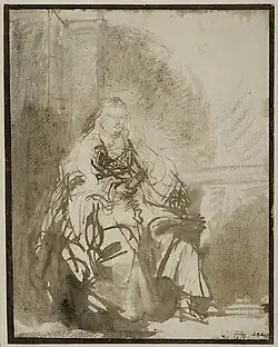 ![]() | Seated Woman with a Rolled-up Letter | c. 1635 | Pen and brown ink, washes in brown | 24 x 19 cm | Nationalmuseum, Stockholm | The drawing is related to the etching B340 |