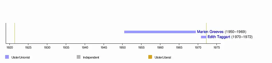 | Elizabeth Maconachie[39] | Ulster Unionist | Queen's University | 1953[42] | 1969[43] | ?? | ?? | ?? | |