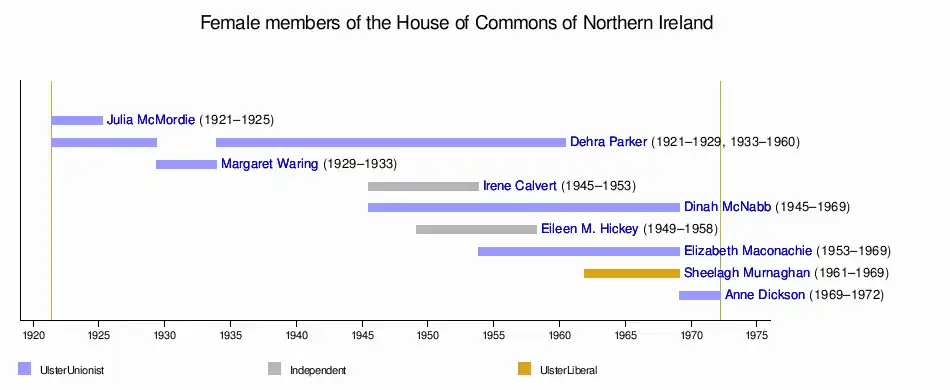 Four of the nine women were elected by the Queen's University of Belfast constituency, including the lawyer Sheelagh Murnaghan (1961–1969). She was the only woman elected at a contested by-election[4] (in November 1961[5][6]), and also the only member of the Ulster Liberal Party ever elected to the Northern Ireland House of Commons.[7] Two of the women (Irene Calvert and Eileen M. Hickey) were independent politicians, both elected by Queen's.