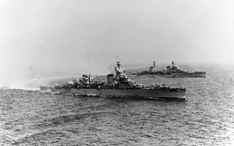 After Italy entered World War II in June 1940, Trento and Trieste saw extensive action against British forces in the Mediterranean Sea, including at the battles of Calabria, Cape Spartivento, and Cape Matapan in July and November 1940 and March 1941, respectively.[3] In November 1941, Trieste was torpedoed by the submarine HMS Utmost; she spent most of the next year under repair. In the meantime, Trento was also present during the inconclusive First and Second Battles of Sirte. The Italian fleet sortied to attack the British Operation Harpoon convoy in June 1942, and while on the way, Trento was torpedoed twice, first by a Bristol Beaufighter torpedo bomber and then sunk by the submarine HMS Umbra with very heavy loss of life on 15 June. Trieste was moved to La Maddalena, Sardinia, where she was later sunk by United States heavy bombers on 10 April 1943.[4]