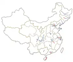 A corridor may consist of two or more parallel lines that take different routes between the same cities, branch and connector lines, and in some cases, connecting lines and lower-speed lines.[37] The Beijing-Shanghai HSR corridor, one of the verticals, comprises the preexisting Beijing-Shanghai HSR, which runs through Tianjin, Jinan, Bengbu, Nanjing, Wuxi and Suzhou, as well as a new high-speed passenger dedicated line from Beijing to Shanghai via Tianjin, Dongying, Weifang, Linyi, Huaian, Yangzhou, and Nantong, as well as HSRs connecting Nanjing, Hefei and Shanghai with Hangzhou.[38] Some corridors consist of a single HSR line; the Shanghai-Kunming HSR corridor, one of the horizontals, is essentially the Shanghai–Kunming High-Speed Railway by another name.[39]
