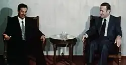 Foreign visits by Saddam Hussein This is a list of international trips made by Saddam Hussein , the former vice president and president of Iraq , from 1968 until his overthrow in the 2003 invasion of Iraq. As vice president, he made state visits to numerous countries and represented Iraq at several events. Following his accession to the seat of presidency and coinciding the Iran–Iraq War , Saddam attended various Arab League summits and global conferences. After the Gulf War , Saddam reduced his foreign visits, due to security reasons and post-war impact.[ 1] [ 2] [ 3]