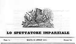 | Lo Spettatore Imparziale | monthly | Italian | 23 April 1838 | pre-1899[5] | Pro-British; edited by Canon Fortunato[4]: 11 (or Francesco) Panzavecchia[6] | |
