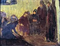 | 1896[107][108] 37 years old | Living in Paris | Won a gold medal at Paris Salon 1897, bought by French Government, brought honor to Tanner that he no longer had to submit paintings to a committee before entering them in the Salon.[109] | Raising of Lazarus or Resurrection of Lazarus[107][108] | Musée d'Orsay, RF 1980 173. Oil on canvas, 37 x 48 in. (94.7 x 120.5 cm.)[107][108] | ![]() | |