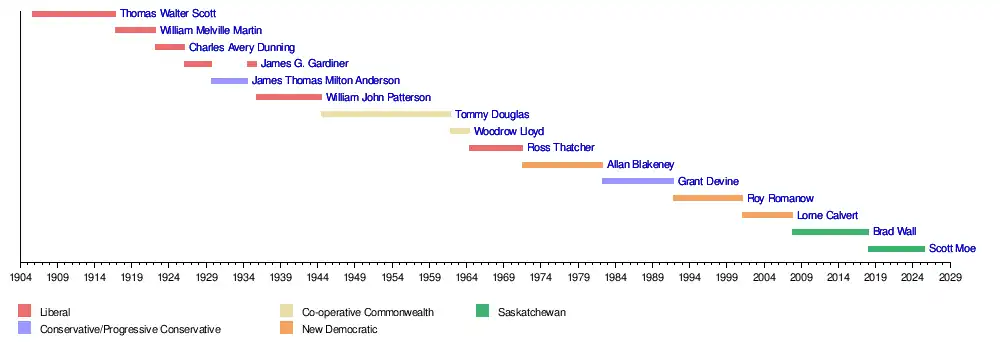 | 1 | ![]() | Thomas Walter Scott (1867–1938) | 12 September 1905 | 20 October 1916 | Title created (caretaker government) | Liberal (Ldr. 1905) | MLA for Lumsden (1905–1908) MLA for Swift Current
