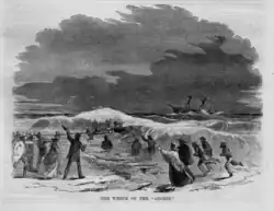8 March List of shipwrecks: 8 March 1859 Ship State Description Adonis Bremen Illustration "The Wreck of the 'Adonis'" from Harper's Weekly , 1859. Bound from Newcastle , England , to New York City with a cargo of "124 grindstones , 600 lead ingots , 39 casks of ground flint , 100 casks of alkali , 501 casks of soda, 170 casks of powder, 130 casks of sodium carbonate , 200 casks of "V. red", and 500 kegs of C. soda ", the 550-gross register ton full-rigged ship or barque (sources disagree) was wrecked at Long Branch , New Jersey , in a heavy fog . Her entire crew of 12 survived. She broke up in the surf on 18 March. Her wreck eventually sank in 25 feet (8 m) of water. Her wreck and that of SS Rusland – wrecked on top of Adonis ' s wreck in 1877 – are known as the "Dual Wrecks."[ 19] [ 20] Cossack Guernsey The brig ran aground on the Cant Sand, in the Thames Estuary and sank. Her crew were rescued by the smack Hannah ( United Kingdom ). Vesta was on a voyage from Guernsey to London .[ 21] Ellen Margaret United Kingdom The barque was driven ashore on Amrum , Duchy of Holstein . Her crew were rescued (29 March?). She was on a voyage from Hartlepool , County Durham to Hamburg . Ellen Margaret broke up the next day.[ 22] [ 23] Gonsalve France The schooner was wrecked on the Doom Bar . Her seven crew were rescued by the Padstow Lifeboat Royal Albert ( United Kingdom ). Gonsalve was on a voyage from Nantes , Loire-Inférieure to Londonderry , United Kingdom .[ 24] [ 18] [ 25] Sandford United Kingdom The ship was wrecked at Mauritius .[ 26]