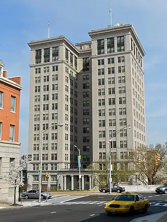 Shortly after, the 1893 construction of the Fidelity Building, of which both are regarded as the first high-rises in the city.[2] The building originally rose eight floors, but an additional seven stories with a terra cotta panels façade designed to match the original earlier grey granite rough-cut stone base, were constructed between 1912 and 1915, bringing the structure's total height to 220 feet (67 m), making it the first building in Baltimore over 200 feet (61 m).[2]
