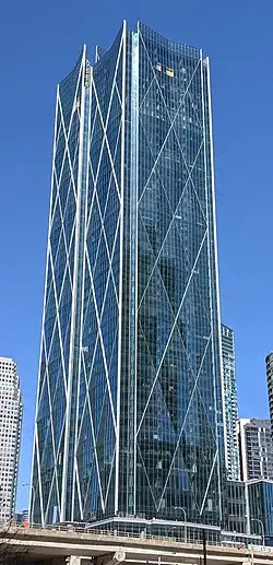 In 2017, the CIBC announced they would be moving their headquarters and 15,000 staff from Commerce Court to a new 270,000 square metre (2.9 million sq ft) development, then named Bay Park Center, where they would be the anchor tenant.[61][62] Construction began the same year on what would become CIBC Square, consisting of twin skyscrapers around 240 m (787 ft) tall, very slightly taller than Commerce Court West. The 49-storey south tower was completed in 2021, with the 50-storey north tower joining it in 2025. The complex's facade is distinguished by its undulating glass facade that resembles the shape of diamonds, which were designed to modulate incoming light.[63][64] In addition, the complex also serves as a transit hub, with a bus station in the podium with connections to Union Station directly to its north.[65] CIBC will retain offices in Commerce Court, which is only a few blocks away.