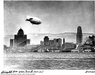 The Great Fire of Toronto in 1904 destroyed a large section of downtown, but the city was quickly rebuilt. The intersection of King and Yonge streets became a site for some of Toronto's first skyscrapers.[11] In 1906, the Trader's Bank Building was completed. At 55.4 m (182 ft) and 15 storeys, it was the tallest building in the city, in Canada, and in the British Commenwealth until the Royal Liver Building was completed in 1911. The building was innovative in its leasing arrangements; it was the first major Toronto building to introduce the New York system of leasing by the square foot.[12] Already the height of new buildings in Toronto were met with controversy, drawing comparisons with New York City's skyline. One editorial in The Globe wrote that "if the skyscraper habit grows, as there is every indication it will... the lower end of Yonge Street and the central portion of King street will become dim sunless canyons such as one sees in the financial centre of New York."[13]
