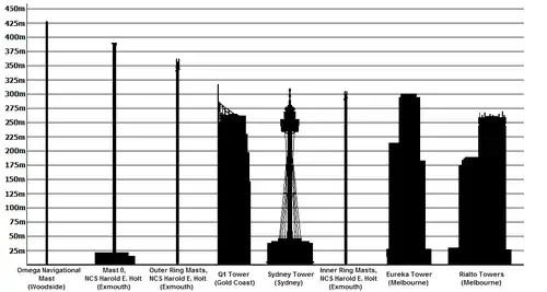 5 | Naval Communication Station Harold E. Holt, Outer Ring Masts | 304 | 997 | | Exmouth, Western Australia | 21°48′24.63″S 114°10′20.31″E / 21.8068417°S 114.1723083°E / -21.8068417; 114.1723083 (Naval Communication Station Harold E. Holt, Mast 1) ; 21°49′01.16″S 114°10′39.87″E / 21.8169889°S 114.1777417°E / -21.8169889; 114.1777417 (Naval Communication Station Harold E. Holt, Mast 3) ; 21°49′35.33″S 114°10′15.87″E / 21.8264806°S 114.1710750°E / -21.8264806; 114.1710750 (Naval Communication Station Harold E. Holt, Mast 5) ; 21°49′32.92″S 114°09′32.17″E / 21.8258111°S 114.1589361°E / -21.8258111; 114.1589361 (Naval Communication Station Harold E. Holt, Mast 7) ; 21°48′56.42″S 114°09′12.74″E / 21.8156722°S 114.1535389°E / -21.8156722; 114.1535389 (Naval Communication Station Harold E. Holt, Mast 9) ; 21°48′22.25″S 114°09′36.73″E / 21.8061806°S 114.1602028°E / -21.8061806; 114.1602028 (Naval Communication Station Harold E. Holt, Mast 11) | 6 guyed masts (VLF-Transmitter) |