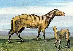 Life restoration of the Miocene camel Aepycamelus, or the long-necked camel. Heinrich Harder (1920). - †Aerugoamnis – type locality for genus