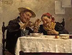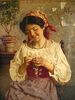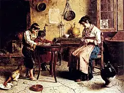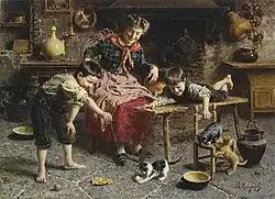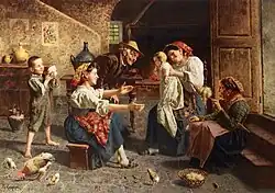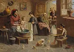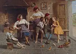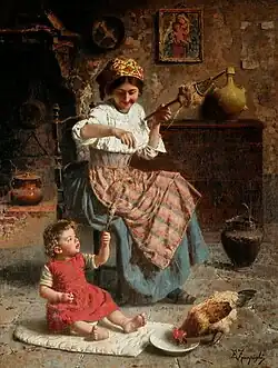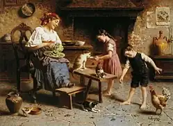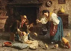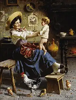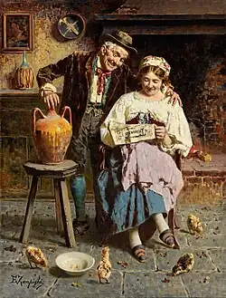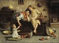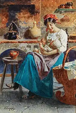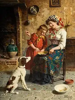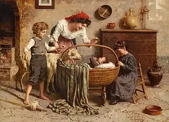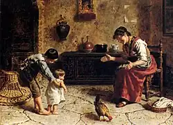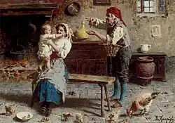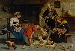 Eugenio Zampighi (1859–1944) was an Italian genre painter and photographer who mainly depicted joyous and idyllic images of Italian rural life, devoid of any hint of social criticism. Zampighi was influenced both by the style of Gaetano Chierici, and by the Florentine Macchiaioli School.