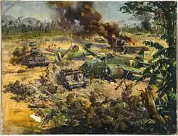 | 1966 | Lance Corporal Rambahadur Limbu winning the Victoria Cross, Sarawak, 21 November 1965, oil on canvas | view | Sir John Moore Barracks, Shorncliffe Camp, Cheriton, Kent | Scene: Rambahadur Limbu VC; Battle of Bau, 21 November 1965; Sarawak, Malaysia. | |