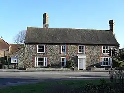 | Ox Brook Cottage | | Coombes 50°51′41″N 0°18′28″W / 50.8615°N 0.3079°W | II | Two cottages share this two-storey building, which existed by the 18th century. The façade has a three-window range and is clad in flint with some brickwork. The slate hipped roof also has a pentice at one corner, and there is a squat chimney in the centre. | [62] |